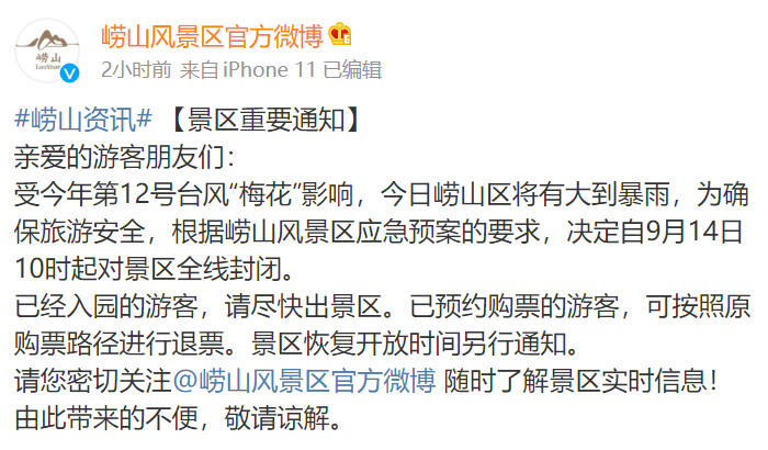 受今年第12号台风“梅花”影响,今日崂山区将有大到暴雨,为确保旅游安全,根据崂山风景区应急预案的要求,决定自9月14日10时起对景区全线封闭。