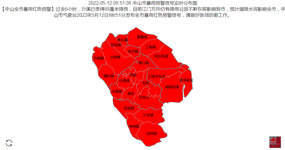 中山市气象台2022年5月12日8时51分发布全市暴雨红色预警信号,请做好各项防御工作。
