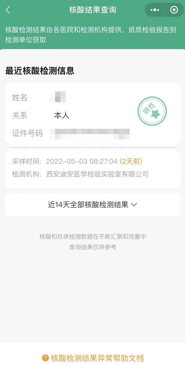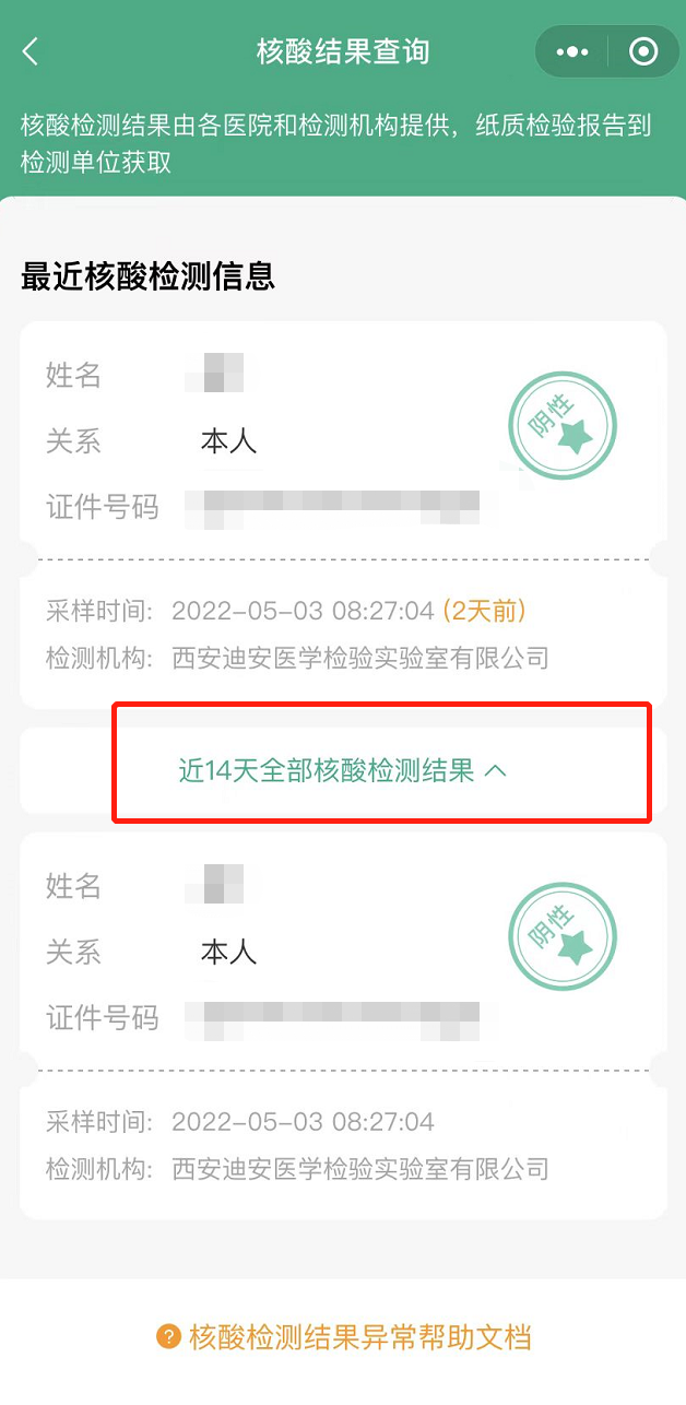 步骤三:进入界面,可查询近期核酸检测结果信息,下拉查询近14天内核酸检测结果。