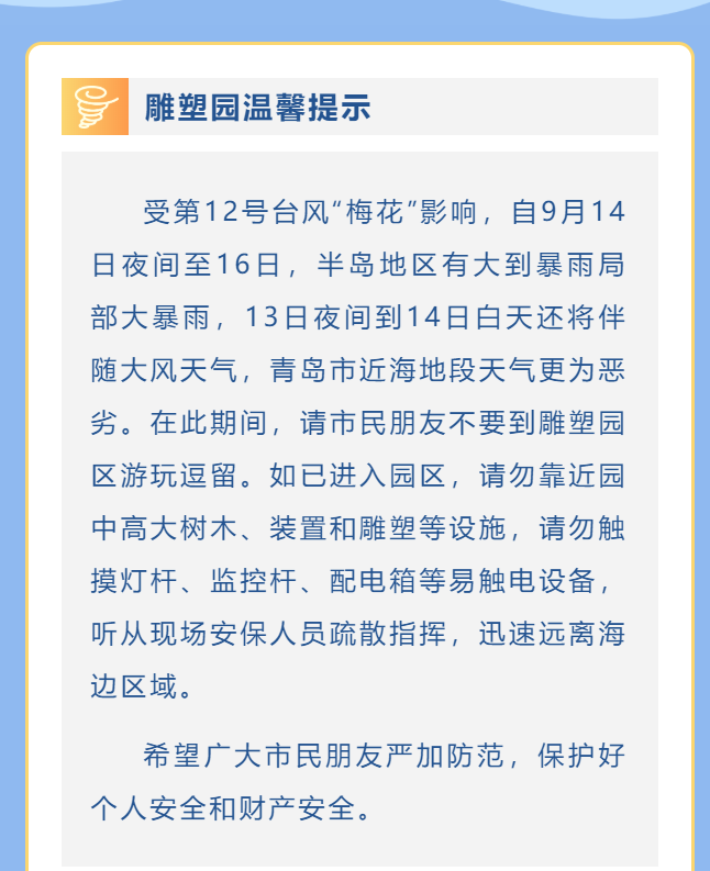 受第12号台风“梅花”影响,自9月14日夜间至16日,半岛地区有大到暴雨局部大暴雨,13日夜间到14日白天还将伴随大风天气,青岛市近海地段天气更为恶劣。在此期间,请市民朋友不要到雕塑园区游玩逗留。如已进入园区,请勿靠近园中高大树木、装置和雕塑等设施,请勿触摸灯杆、监控杆、配电箱等易触电设备,听从现场安保人员疏散指挥,迅速远离海边区域。