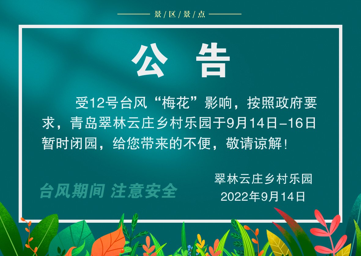 受12号台风“梅花”影响,按照政府要求,青岛翠林云庄乡村乐园于9月14日-16日暂时闭园,给您带来的不便,敬请谅解!