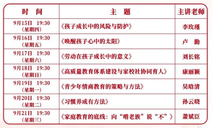 9月15至21日,“学习强国”学习平台将连续七天,以每日一课的方式为广大家长带来由李玫瑾、卢勤、刘长铭、康丽颖、吴晗清、孙云晓、萧斌臣等七位国内著名家庭教育专家的《孩子成长中的风险与防护》《唤醒孩子心中的太阳》《劳动在孩子成长中的意义》《高质量教育体系建设与家校社协同育人》《青少年情商教育的策略与方法》《习惯养成有方法》《家庭教育的底线:向“啃老族”说“不”》等精彩实用的家庭教育公益讲座。