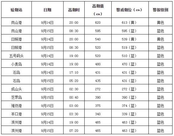 受今年第12号台风“梅花”(强台风级)影响,预计9月14日傍晚至15日下午,山东半岛南部、山东半岛北部、莱州湾和渤海湾沿岸将分别出现40-80cm、30-60cm、60-120cm和50-100cm的风暴增水。岚山港和日照港验潮站将出现达到当地黄色警戒潮位的高潮位,五号码头、小麦岛、石岛、成山头、芝罘岛、潍坊港、羊口港和滨州港验潮站将出现达到当地蓝色警戒潮位的高潮位。山东省日照市预警级别为黄色,山东省青岛市、威海市、烟台市、潍坊市和滨州市预警级别为蓝色。