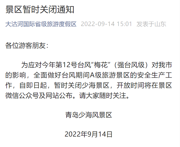 青岛少海风景区受台风梅花影响暂时关闭通知