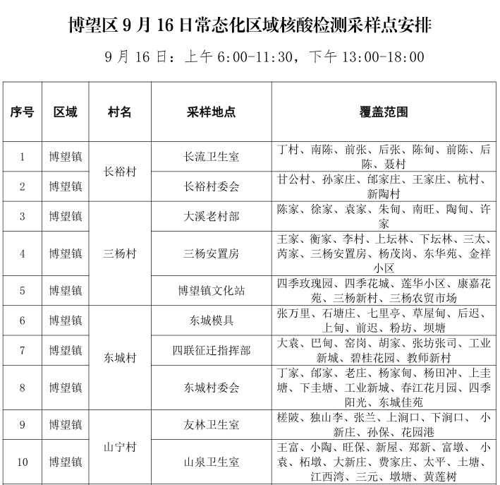 马鞍山博望区9月16至17日常态化区域核酸检测采样点安排