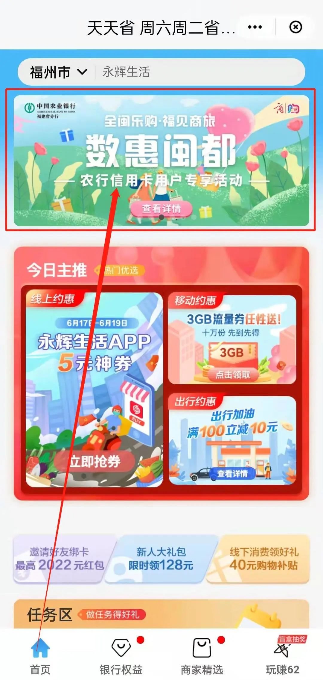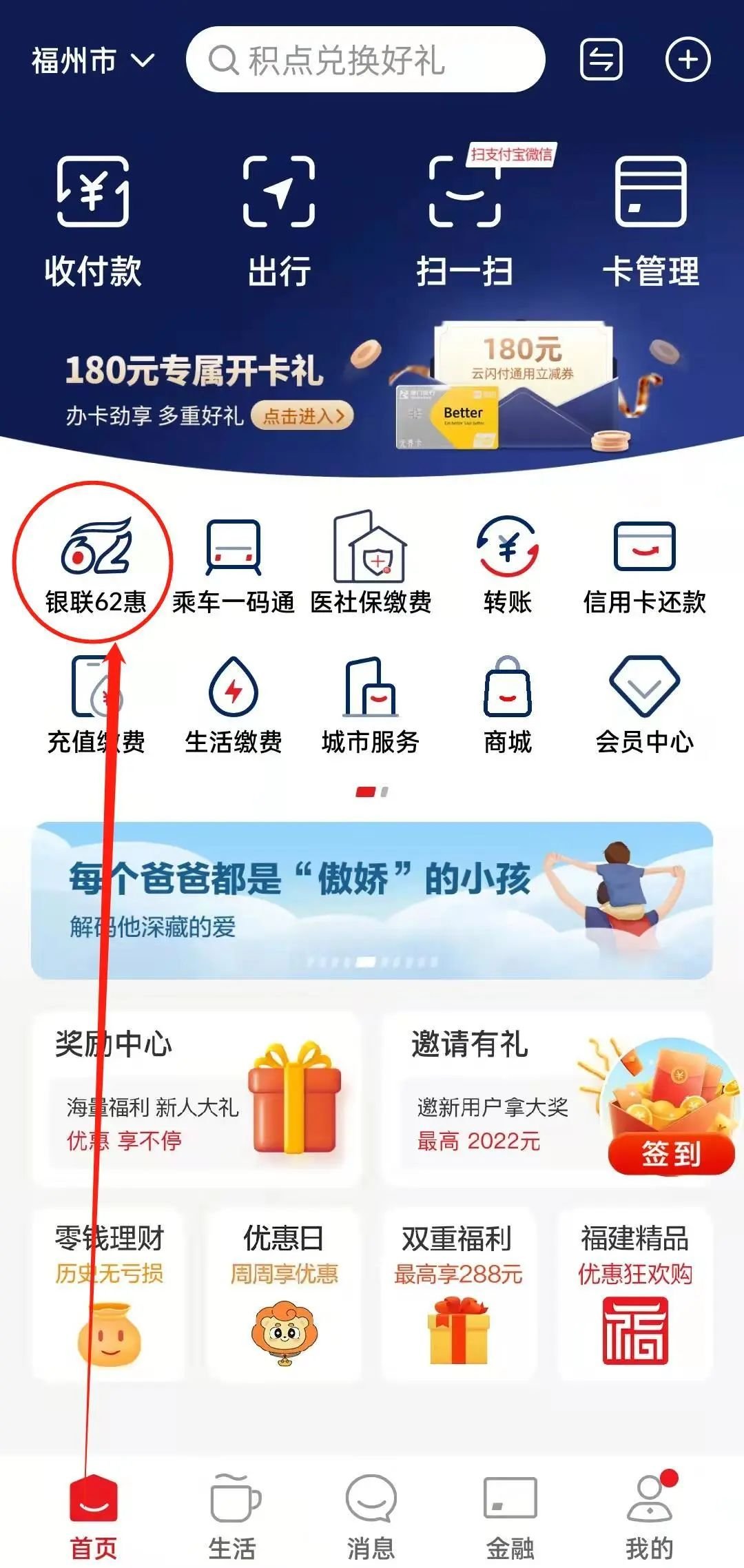 打开云闪付APP首页,点击62惠图标进入“银联62惠”,在顶部轮播图中找到“数惠闽都”轮播图,点击该轮播图即可进入活动页