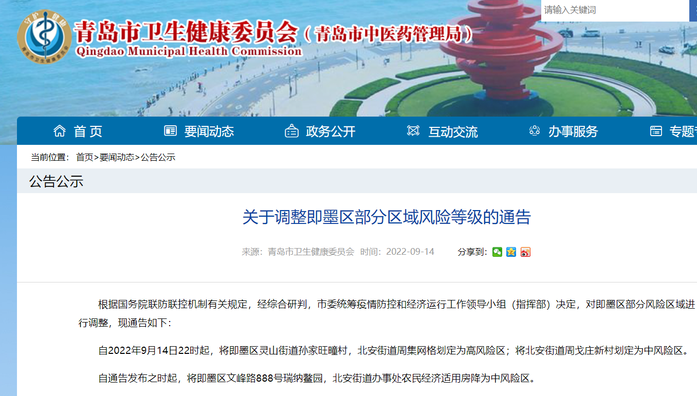 2022年9月14日22时起调整青岛即墨区部分区域风险等级