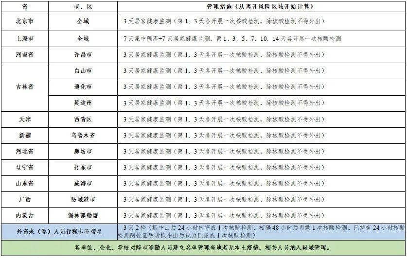 3、上海市全域来(返)中山人员,实施7天集中隔离+7天居家健康监测。内蒙古锡林郭勒盟、广西防城港市、河南许昌市、吉林白山市、吉林通化市、吉林延边州、新疆乌鲁木齐、天津西青区、辽宁丹东市、北京市全域以及行程卡带星来(返)中山人员,实施3天居家健康监测(除核酸检测不外出)。