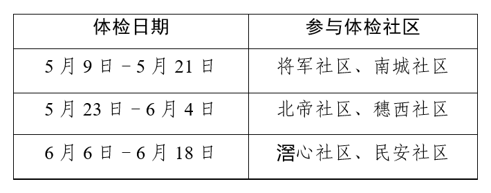 2022年5月9日—6月18日期间,南头镇将在中山市广济医院对辖区老年人开展集中体检。为做好疫情防控工作,请各社区适龄老年朋友按照下表安排有序参与体检。