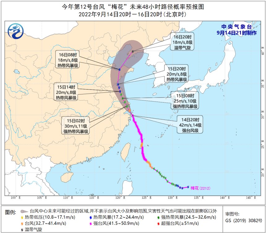 大风预报:9月14日20时至15日20时,东海西部、黄海大部、渤海、渤海海峡、长江口区、杭州湾、山东沿海、浙江东部、上海、江苏东部将有6-8级大风,阵风9-11级,其中东海北部偏西海域、杭州湾、长江口区、浙江中北部沿海、上海沿海、江苏东部沿海将有9-11级大风,阵风12-14级,“梅花”中心经过的附近海面或地区的风力有12-14级,阵风可达15-16级。