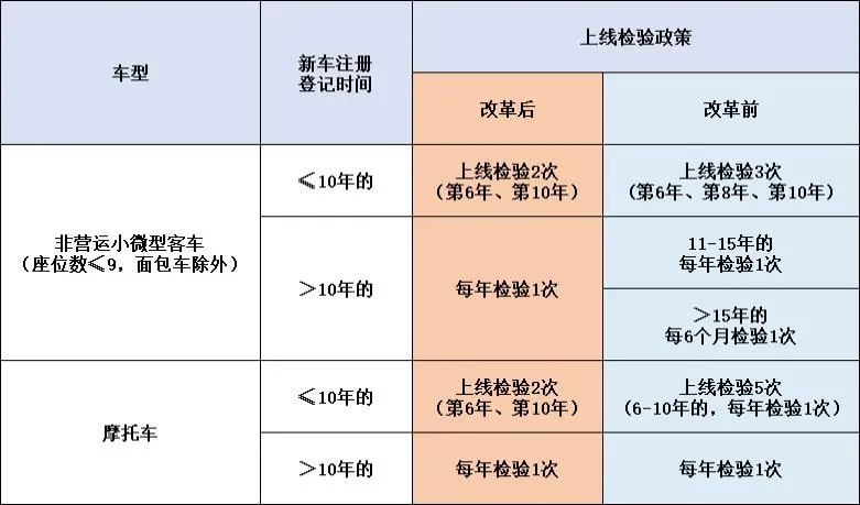 此次调整后,非营运小客车、摩托车在10年内,只需要在第6年、第10年到检验机构上线检验,期间每两年申领一次检验标志;超过10年的,每年上线检验1次。