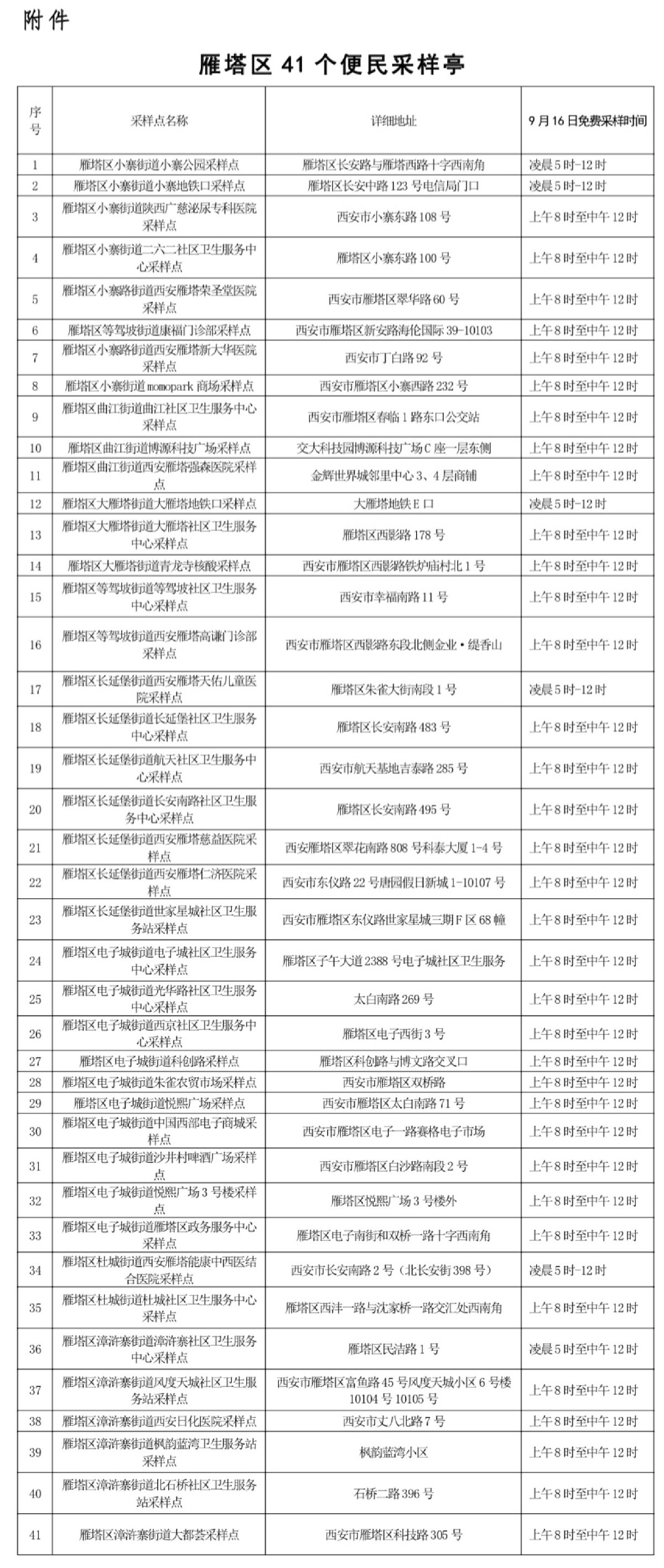 (二)届时,雁塔区41个便民采样亭(见附件)也将免费向广大市民服务,来雁塔旅游的游客可就近选择完成核酸采样。