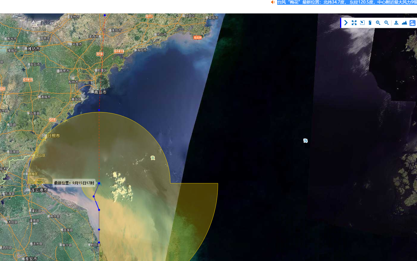 根据中央气象台台风网,台风“梅花”最新位置:北纬34.7度, 东经120.5度,中心附近最大风力9级