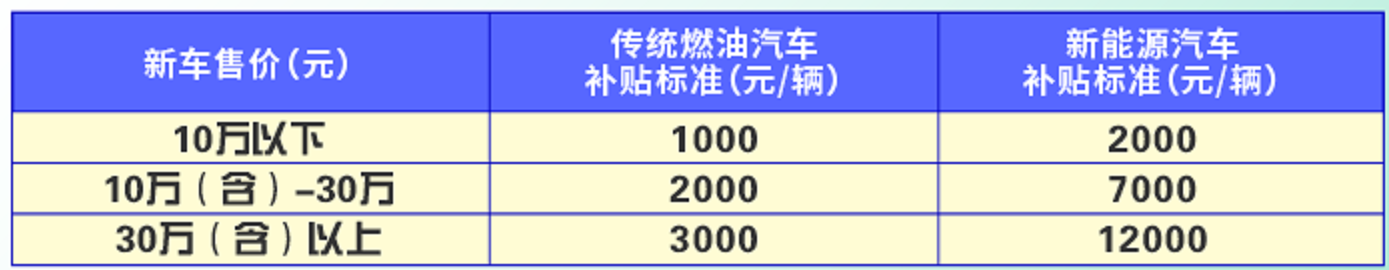 在活动期内购买新汽车,根据新车售价(机动车销售统一发票中的加税合计数,下同)按以下标准给予补贴: