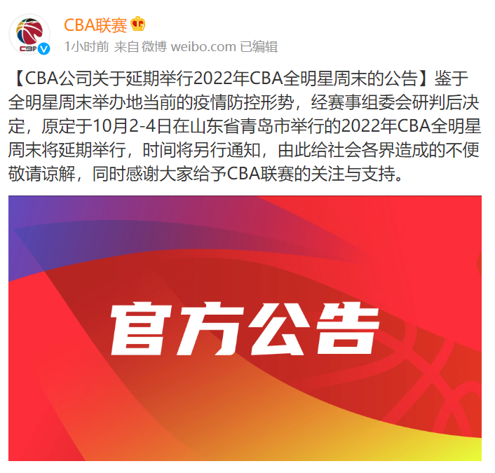 鉴于全明星周末举办地当前的疫情防控形势,经赛事组委会研判后决定,原定于10月2-4日在山东省青岛市举行的2022年CBA全明星周末将延期举行,时间将另行通知,由此给社会各界造成的不便敬请谅解,同时感谢大家给予CBA联赛的关注与支持。