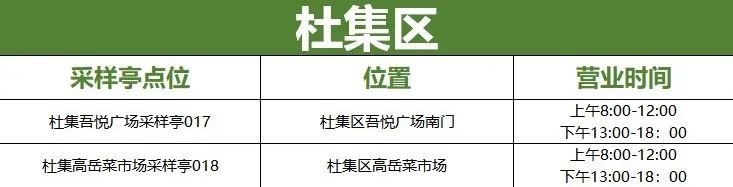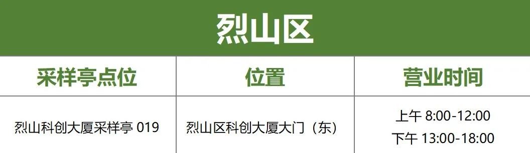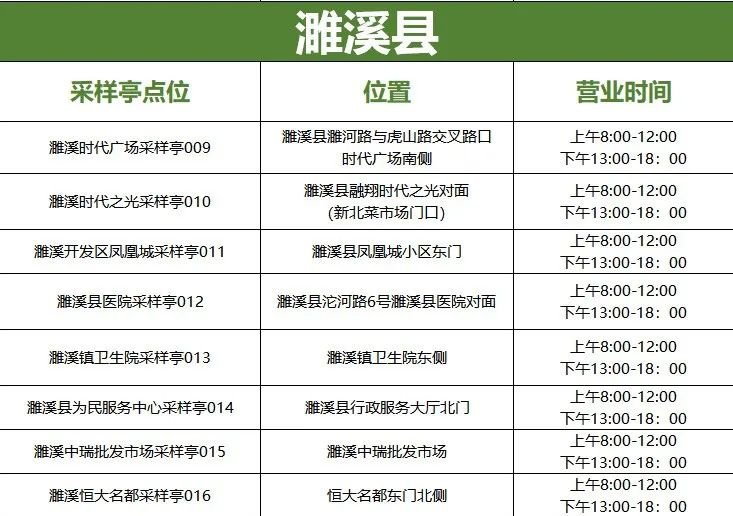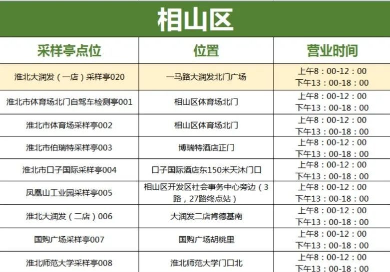 截至目前,天博检验已在淮北设立20个便民核酸采样亭,以下为各采样亭信息。