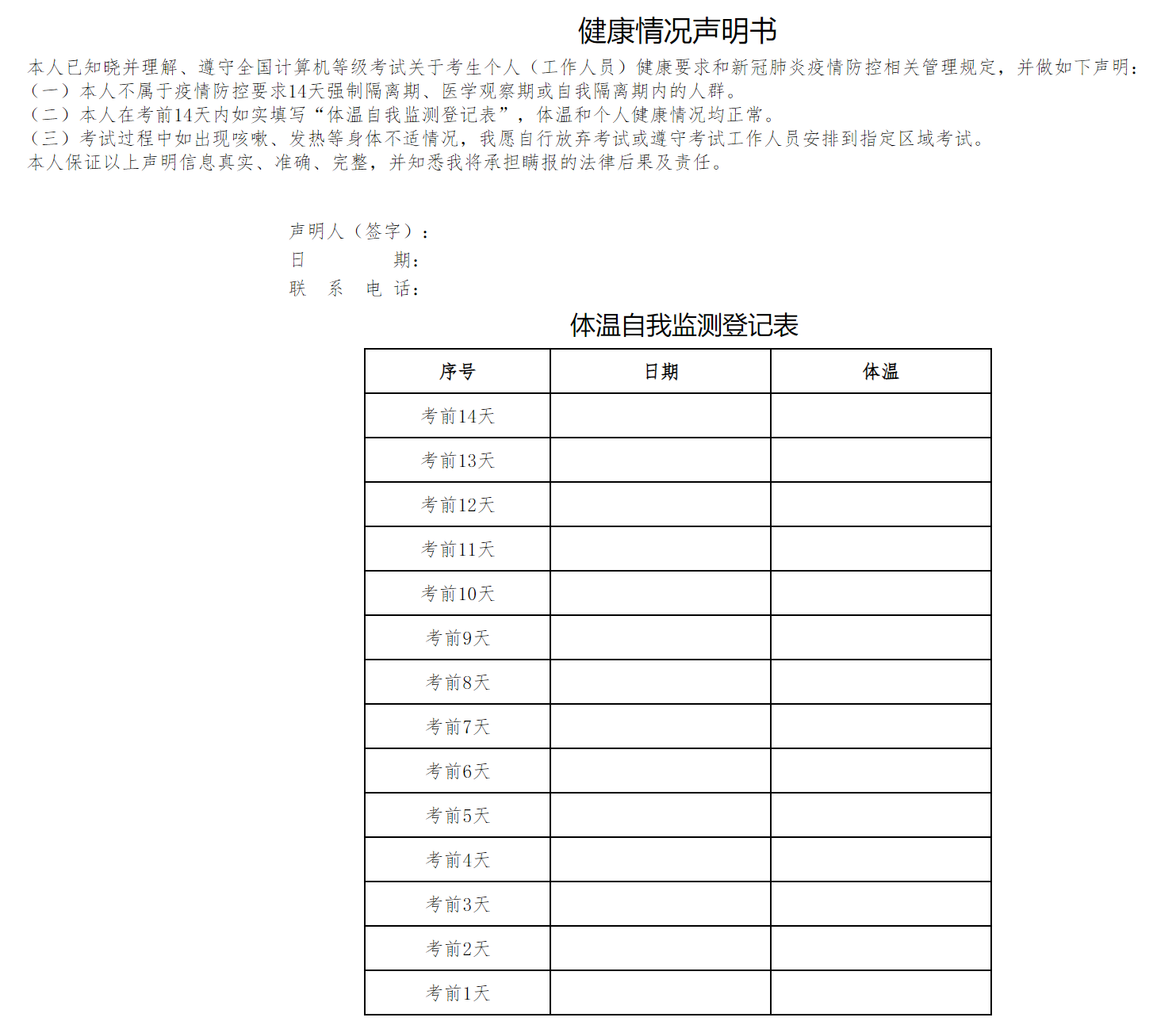 1、所有参加考试的考生应在考前14天起,每日自行体温测量,填写“体温自我监测登记表”(每位考生每科目一张),出现身体异常情况的要及时就医并报告。登记表在考试当天入场检查时上交并保留3个月备查。