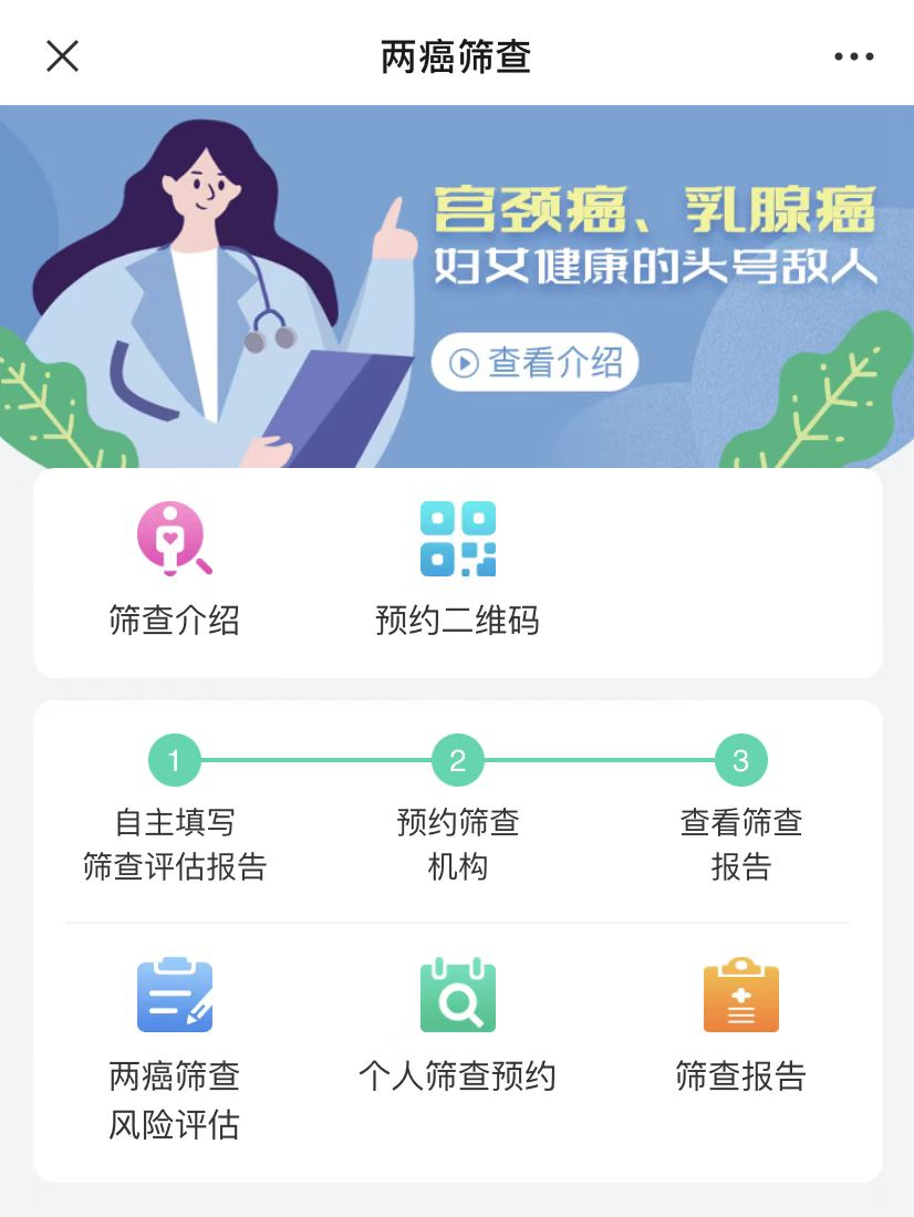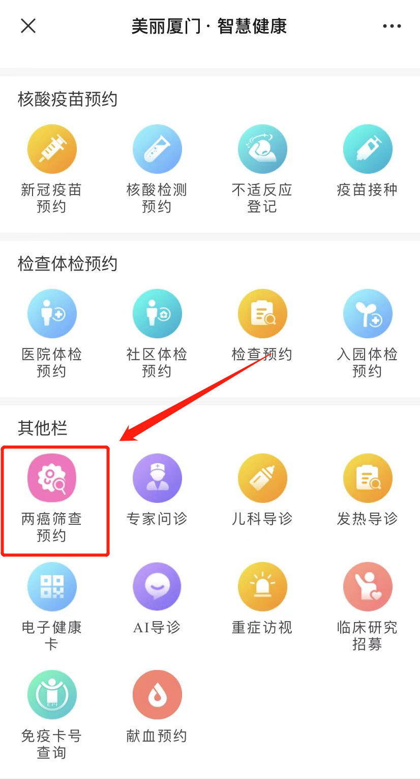 关注“美丽厦门智慧健康”微信公众号☞选择预约导诊选项☞点击其他栏☞两癌筛查预约
