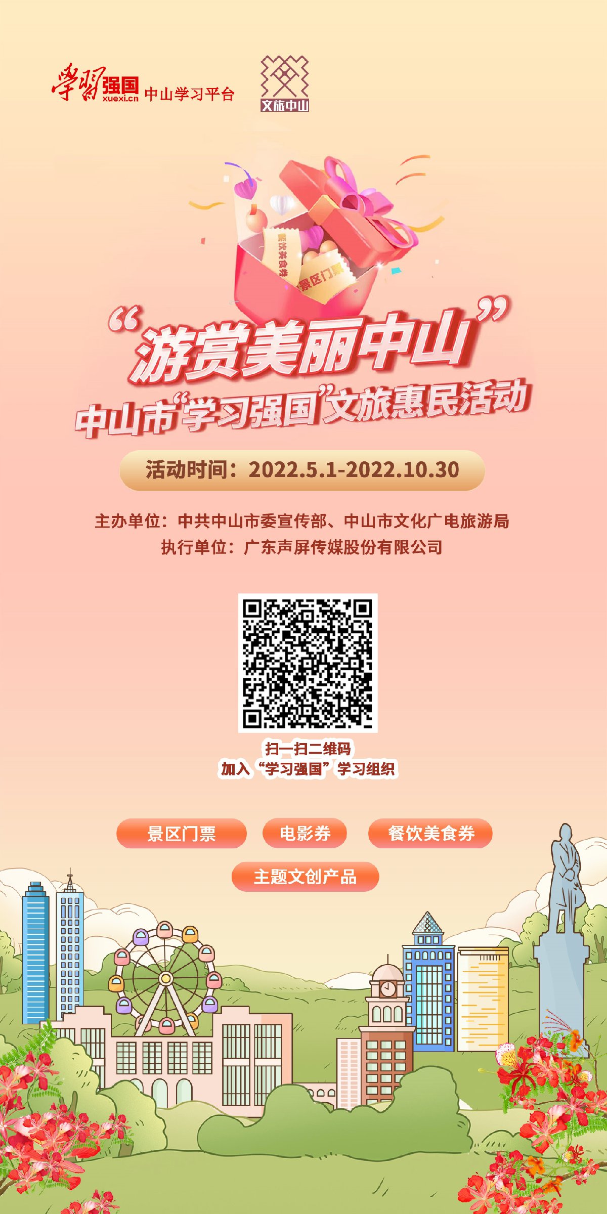 活动结束后将从所有参加活动的“学习强国”用户中抽取10名幸运儿,他们可获得全套中山文旅大礼包~一起来参与吧!