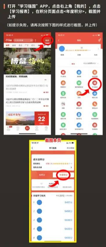 1、下载注册并登录“学习强国”账号,“学习强国”用户需先加入“中山文旅惠民2022”组织。打开“学习强国”APP,点击右上角【我的】,点击【学习报表】,在积分页面点击<年度积分>,截图上传。