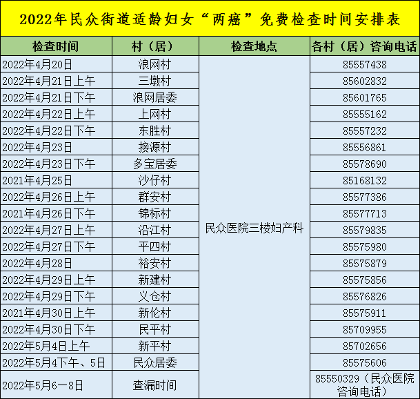 民众街道辖区内适龄妇女“两癌”筛查采取知情自愿、方便群众、项目免费和全程服务的原则。民众医院是民众街道定点筛查机构。