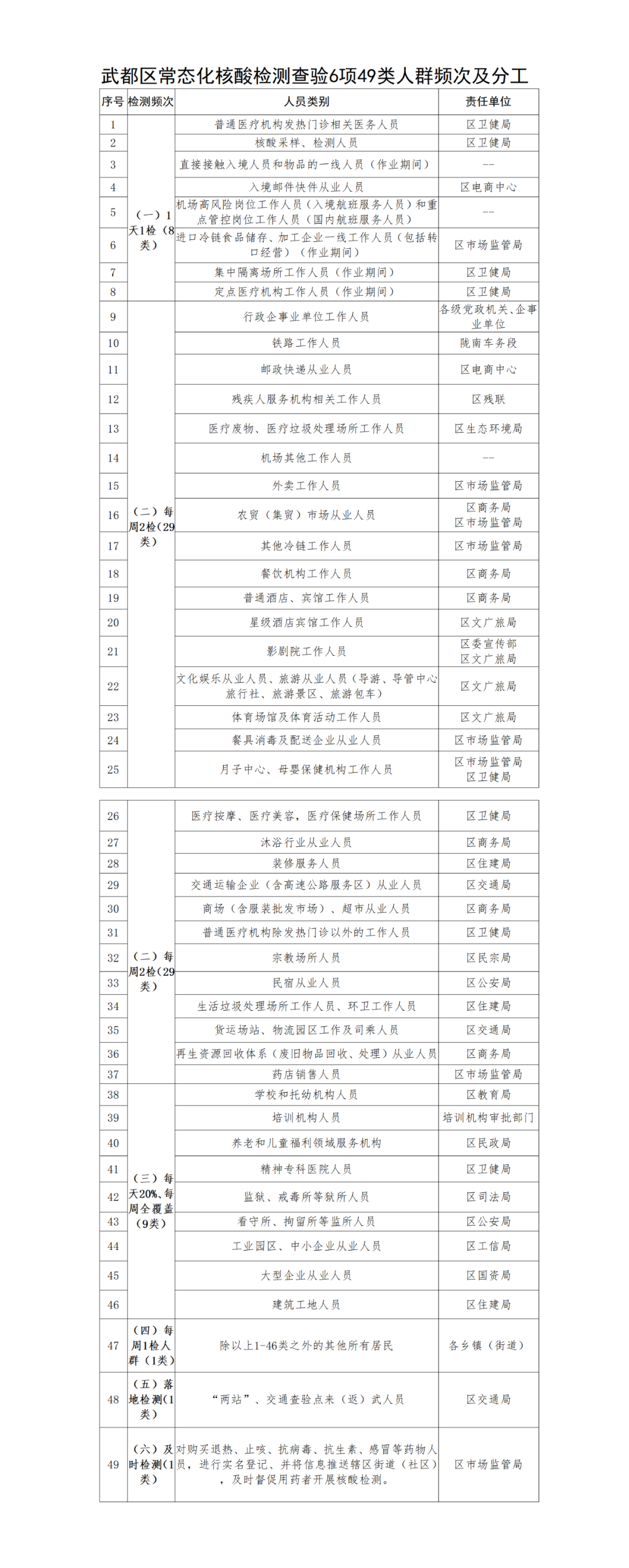 按照应检尽检、不漏一人的原则和常态化核酸检测“一周全覆盖”的要求,根据疫情形势需要,对全区6项49类人群(关于进一步优化常态化核酸检测及查验的通告),按1天1次到1周1次不同频次开展定期核酸检测。