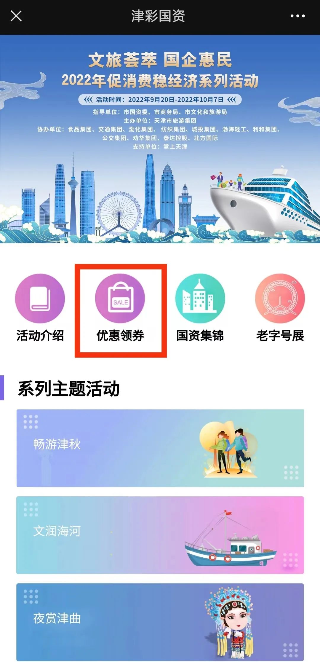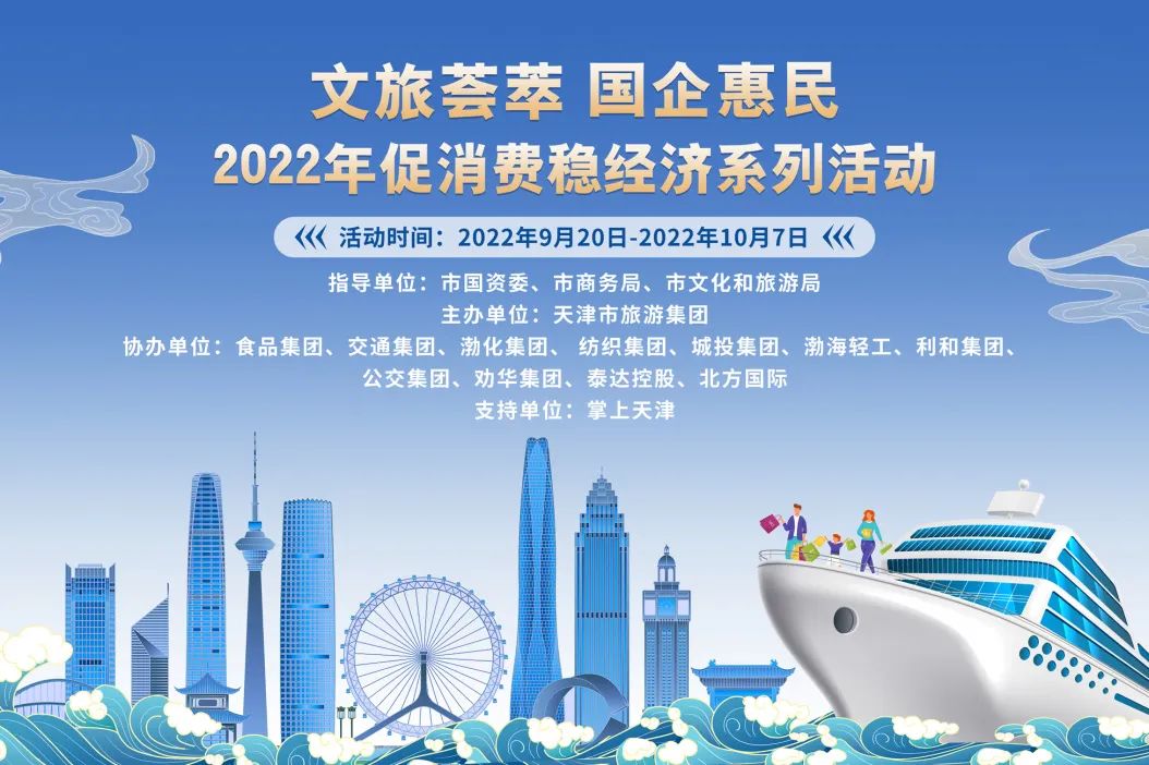 天津“文旅荟萃 国企惠民”2022年促消费稳经济系列活动于9月20日至10月7日举办。活动由市国资委、市商务局、市文旅局指导,天津市旅游集团主办,食品集团、交通集团、渤化集团、纺织集团、城投集团、渤海轻工、利和集团、公交集团、劝华集团、泰达控股、北方国际协办。
