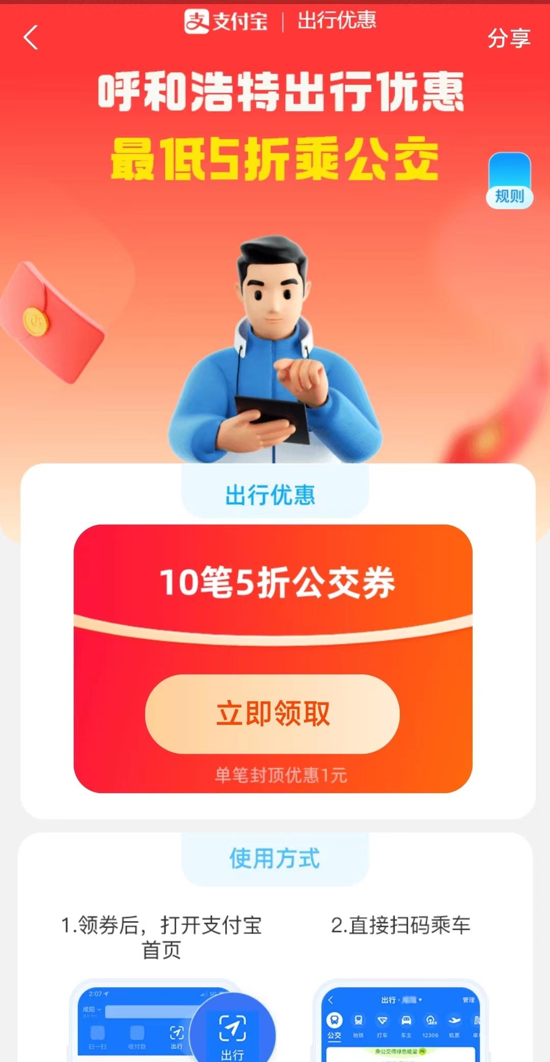 活动二:2022年10月8日后,每周使用支付宝扫码可领最高10元乘车优惠券。打开支付宝App,扫车窗顶旗二维码可领取乘车优惠券。