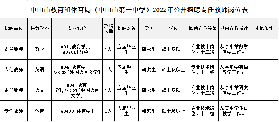 中山市第一中学招聘四位专任教师(中山市第一中学招聘四位专任教师公告)