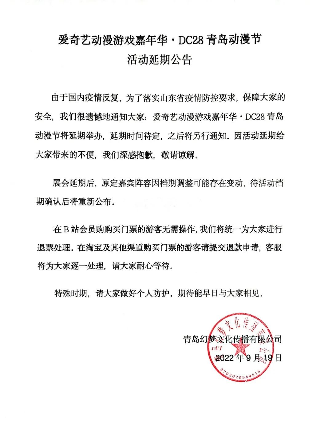 由于国内疫情反复,为了落实山东省疫情防控要求,保障大家的安全,我们很遗憾地通知大家:爱奇艺动漫游戏嘉年华·DC28青岛动漫节将延期举办,延期时间待定,之后将另行通知。因活动延期给大家带来的不便,我们深感抱歉,敬请谅解。