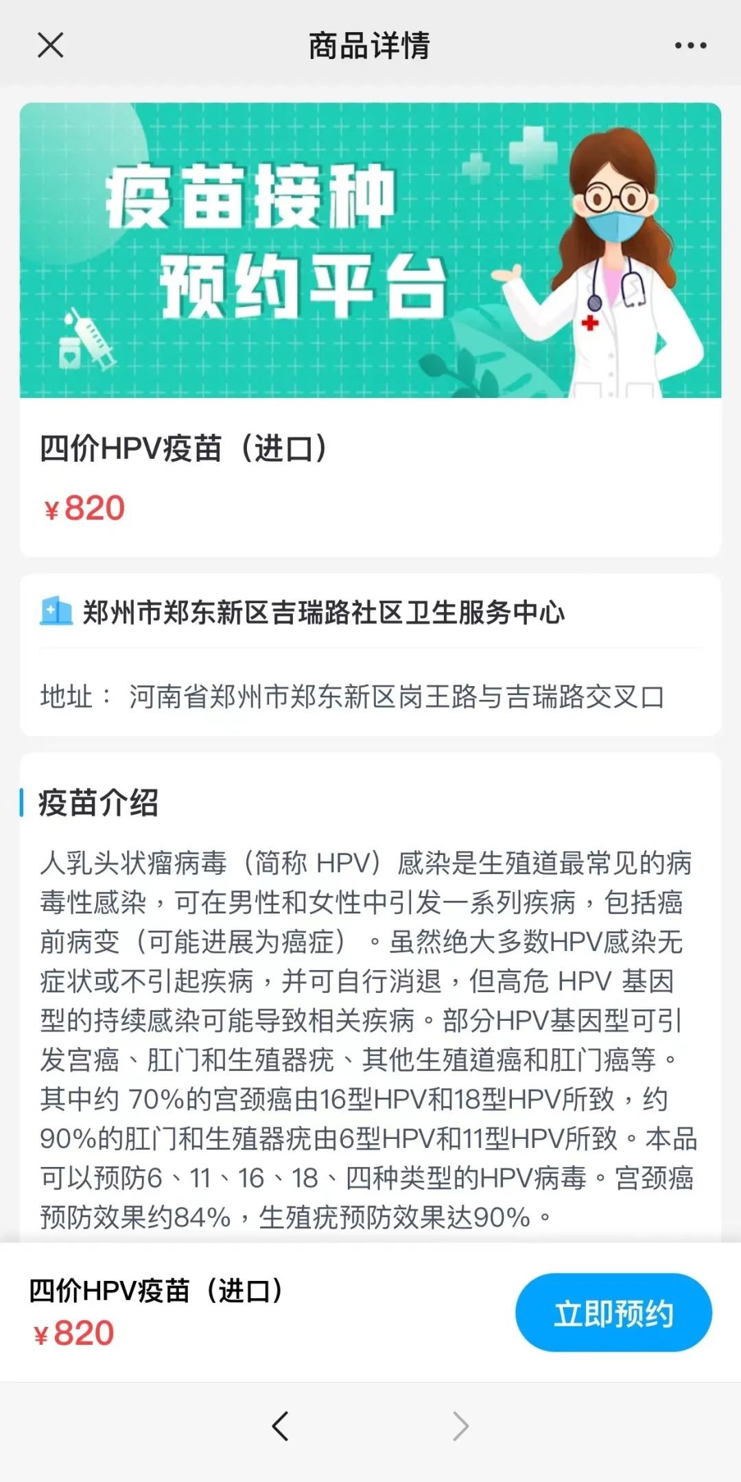 郑东新区吉瑞路社区卫生服务中心四价HPV疫苗到货预约通知