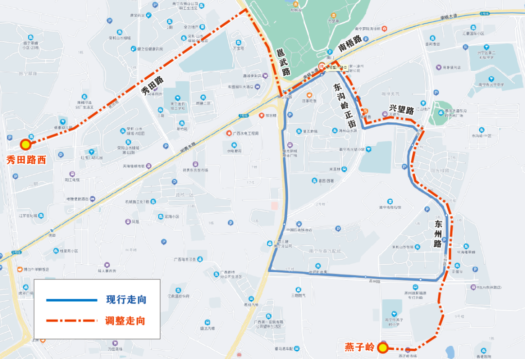 沿途设置“燕子岭、东州燕州路口(上行)、东州路西一街路口、兴望东州路口(下行:东州兴望路口)、东沟岭兴望路口、南梧望州路口、邕武明秀路口(下行)、明秀东路小学、秀田泸田路口、秀田路西”8对往返停靠站点以及2个单边停靠站点。