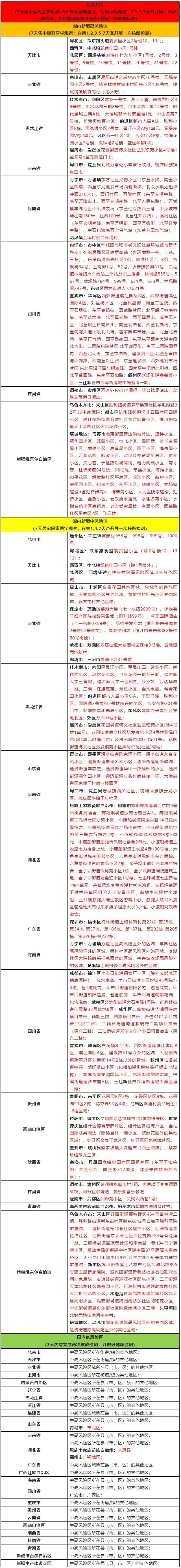 备注:以上表格所列为与昨日名单相比,国内各省(市)新增的中、高风险区;既往尚未解除的中、高风险区未列入,详细名单可实时通过国务院小程序或中国政府网进行查询(点击可查询各地风险等级)。