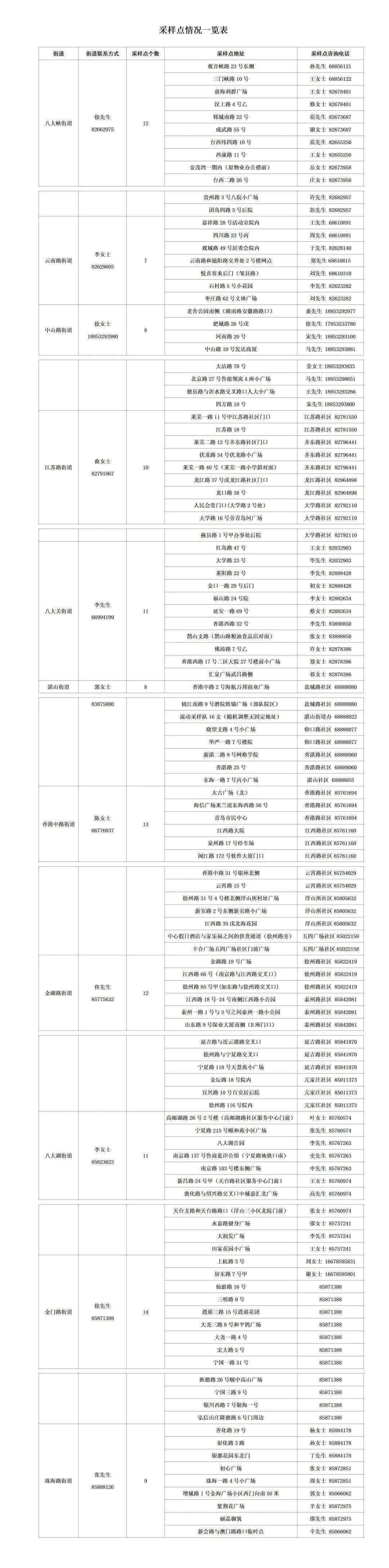 由各街道办事处统一安排采样点,具体信息详见采样点情况一览表(附后),或扫描“市南区核酸检测采样点地图小程序”(附后),对核酸检测采样点进行查询。