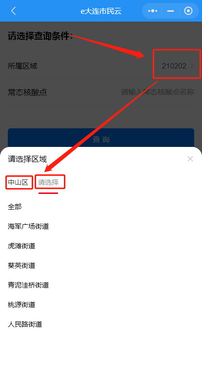 二、进入点位查询页面,选择自己所在区及街道,点击查询即可看到所在街道各社区点位地址、电话、开放时间,根据定位前往距离自己最近的点采样前往采样即可