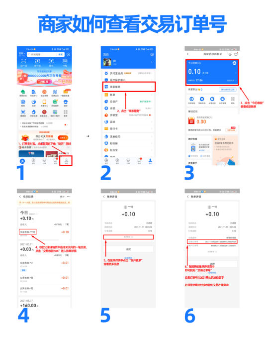 步骤1:打开支付宝,点击首页右下角的“我的”图标;步骤2:点击“商家服务”;步骤3:点击“今日收款”,查看收款账单;步骤4:收款记录详情页中,选择30天内的任意一笔交易,点击“交易收款xxx”进入账单详情;步骤5:在账单详情中点击“展开更多”查看更多信息;步骤6:在展开的账单详情页中即可找到“交易订单号”(交易订单号为2022开头的28位数字,必须使用支付宝收款的交易才可进行查询)
