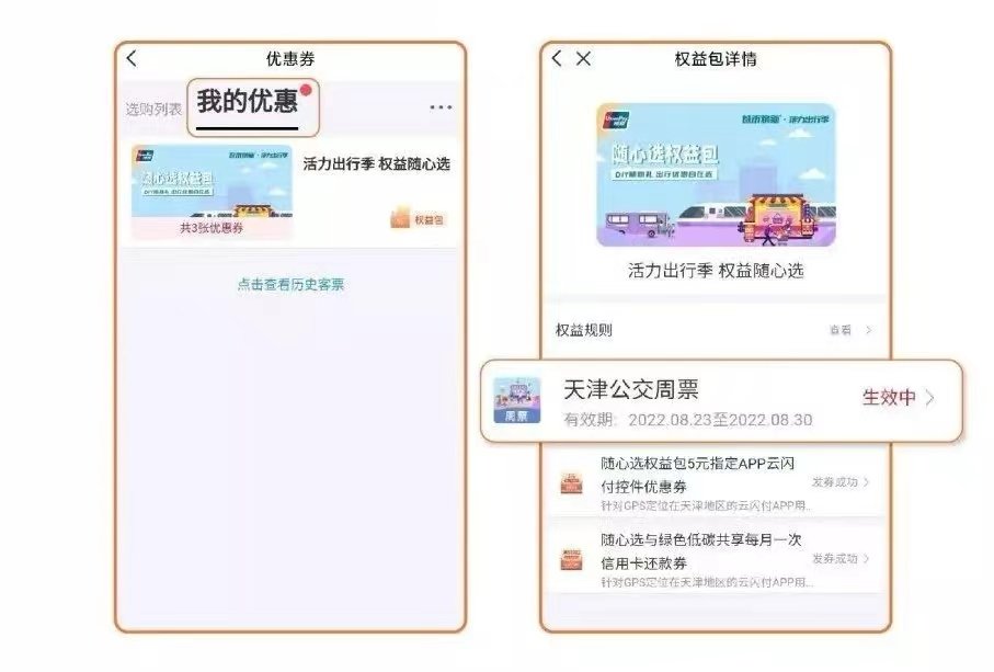 天津云闪付公交随心选权益包优惠券领取+使用攻略