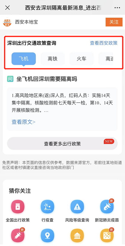 第三步:除查看西安到目的地总的政策之外,也可下拉查看不同交通出行工具返回目的地城市具体的政策,也可切换查看不同交通工具到西安相应规定。