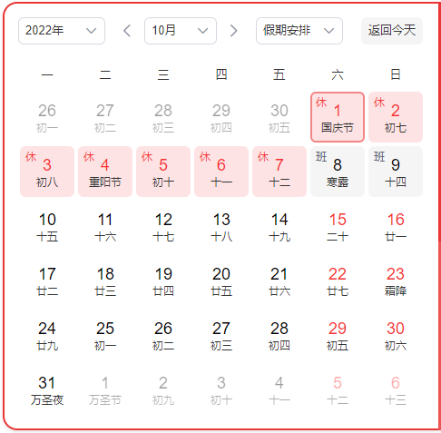 2022国庆假期时间为:10月1日-10月7日,十一假期为法定节假日,不限行。