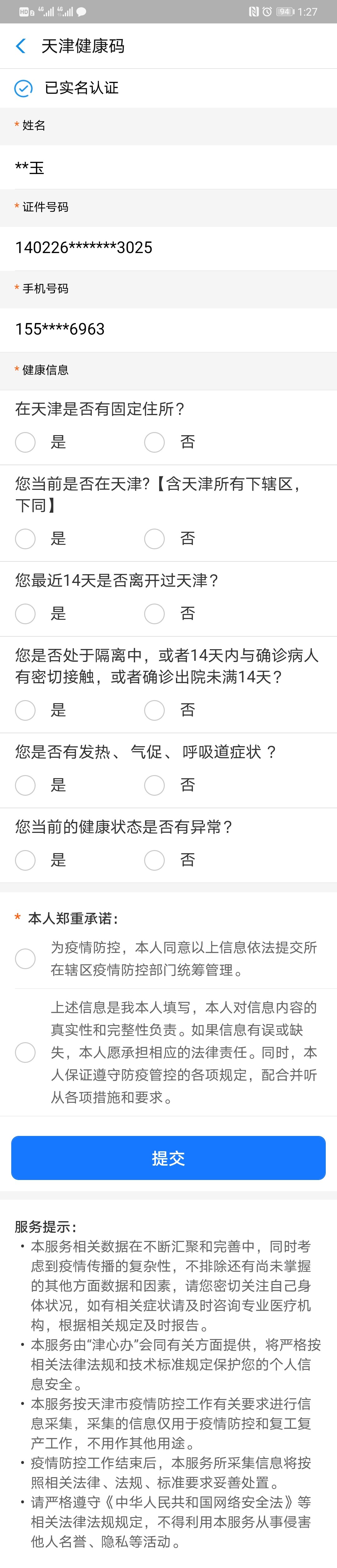 2、填写健康信息并确认提交