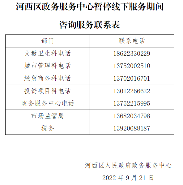 一、自即日(2022年9月21日)起,河西区政务服务中心实体大厅暂时停止接待办事群众,全面推行政务服务事项网上受理模式,具体业务恢复时间将视河西区疫情防控情况及时发布通知;
