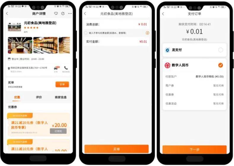 ②确认需要付款的店铺后,点买单,输入付款金额,选择【数字人民币】,点击下一步。