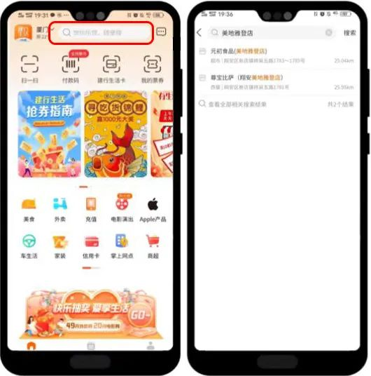 ①打开“建行生活”APP,搜索商户门店名称关键字,APP会显示包含关键字的商户,从中选择选择需要付款的商户。