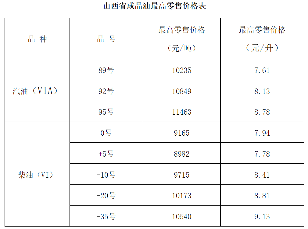根据国家发展改革委门户网站“新闻动态--新闻发布”公布的成品油调价信息,自2022年9月21日24时起,山西省内汽、柴油价格(标准品)每吨分别降低290元和280元(具体价格见附表)。98号汽油价格,按照《国家发改委关于降低国内成品油价格的通知》(发改电[2015]10号)规定,由成品油生产经营企业根据市场情况自主制定具体价格。普通柴油(标准品)最高零售价格按照同阶段标准的车用柴油价格确定。其他相关价格政策按照《国家发展改革委关于进一步完善成品油价格形成机制有关问题的通知》(发改价格[2016]64号)规定执行。