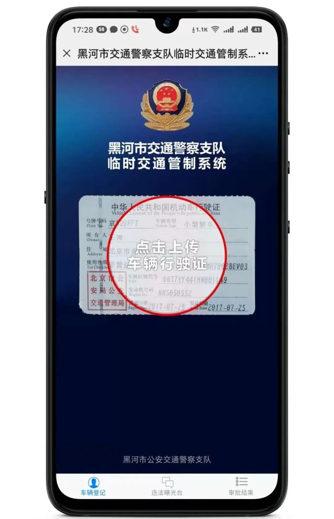 第一步:点击爱辉区及合作区车辆登记,完成机动车行驶证拍摄并上传。