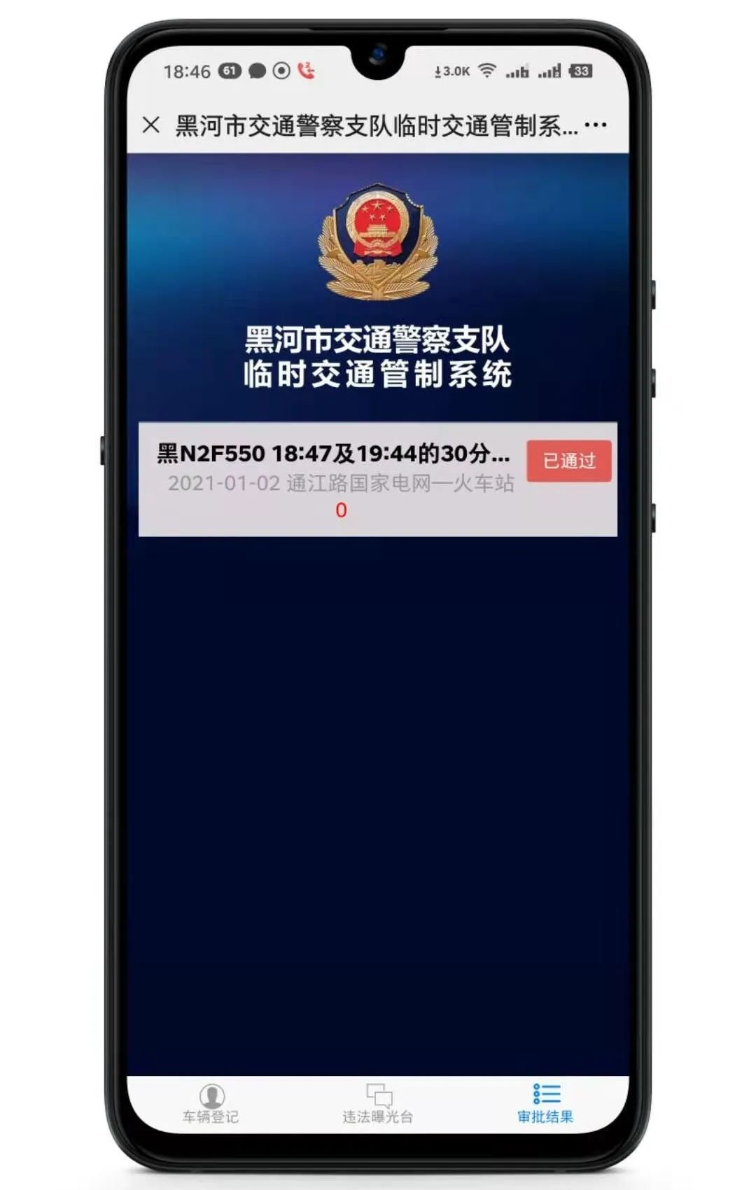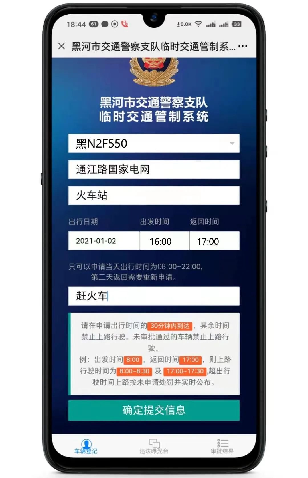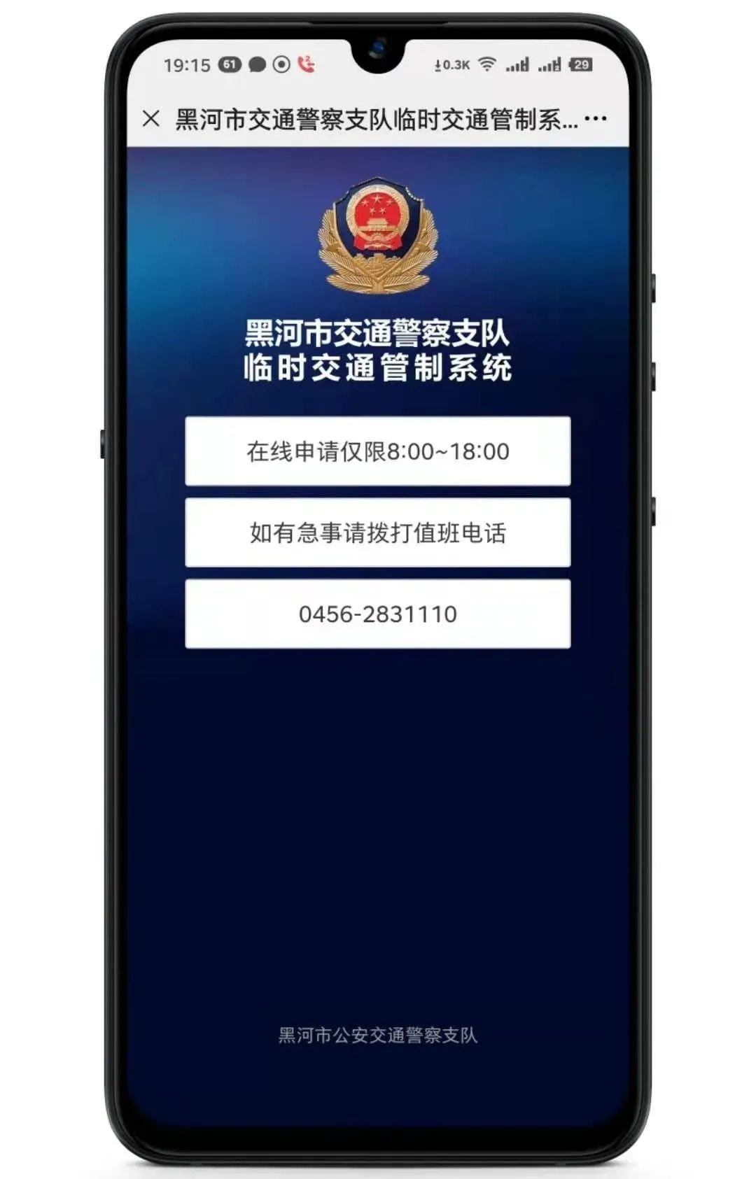 3.黑河市交通警察支队临时交通管制系统在线申请时间为早8:00至晚18:00。申报时间外有极特殊情况必须出行的,可通过电话向黑河市公安交通警察支队指挥中心进行申请报备(电话:0456-2831110)。