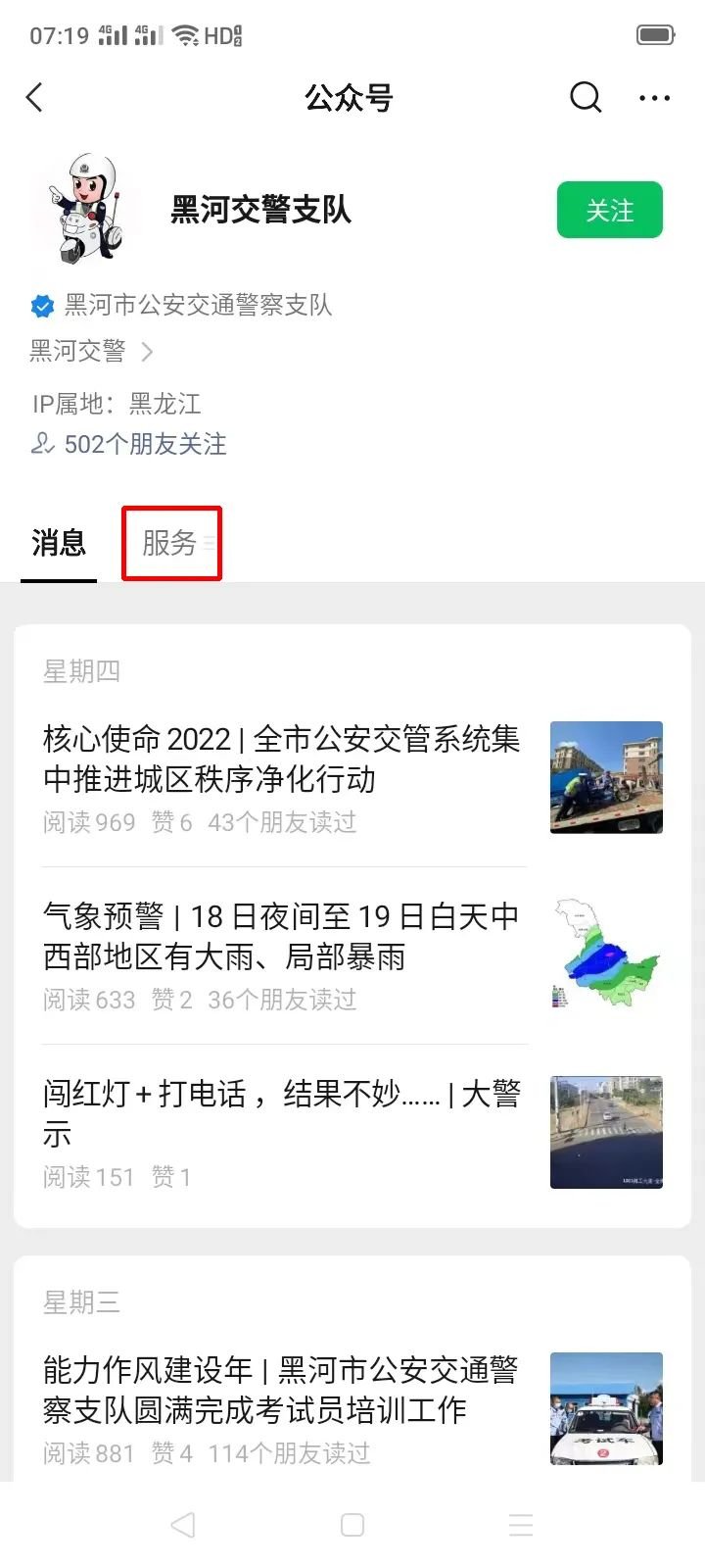 1.进入微信界面,点击订阅号,搜索黑河交警支队并关注,进入微信公众平台: