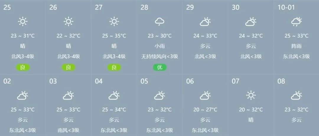 国庆期间辖区天气总体以多云为主,国庆节当天会有阵雨,雨天出行需要格外注意安全哦!