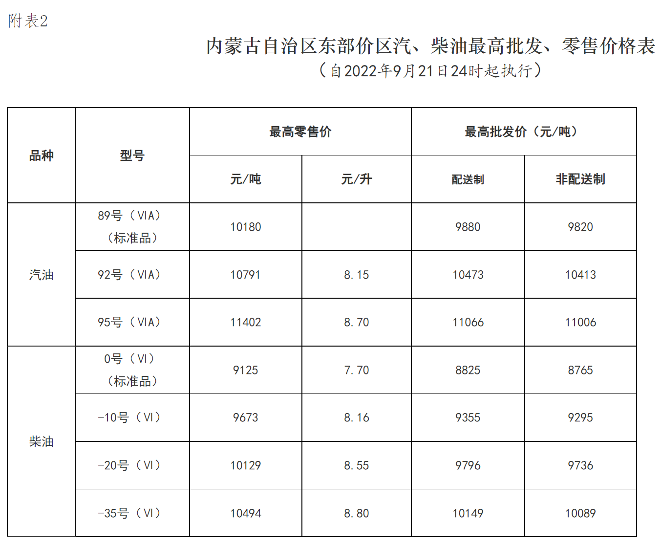 附表2:内蒙古自治区东部价区汽、柴油最高批发、零售价格表