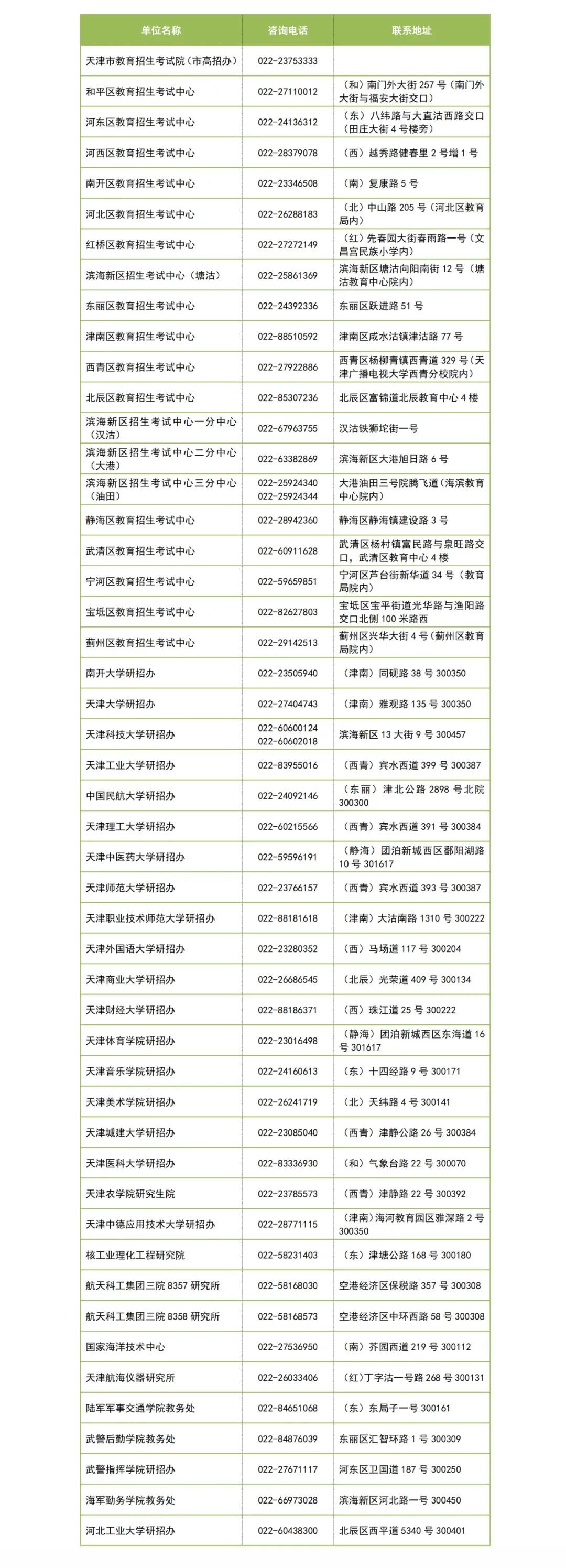 ☑天津市研考各报考点及招生单位联系方式
